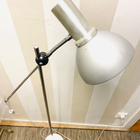 Vit golvlampa, höjd ca 125 cm, i kupan har det varit plastbitar som är borttagna (se bild).