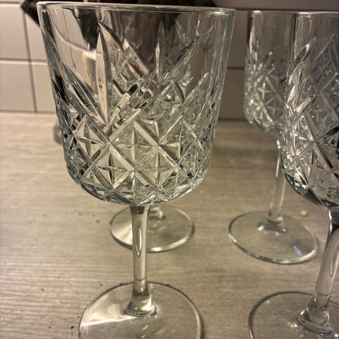 Säljer 8 stycken röda Vinglas med Gravyr vinrankor remarglas. Fint skick.