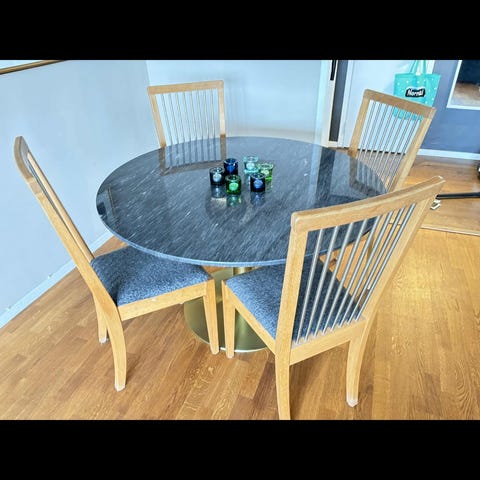 Matbord med en marmorskiva och metallfot. 120 cm diameter. Upp till 6 platser. Alltid haft transparent skyddsduk på. Stolar ingår ej.