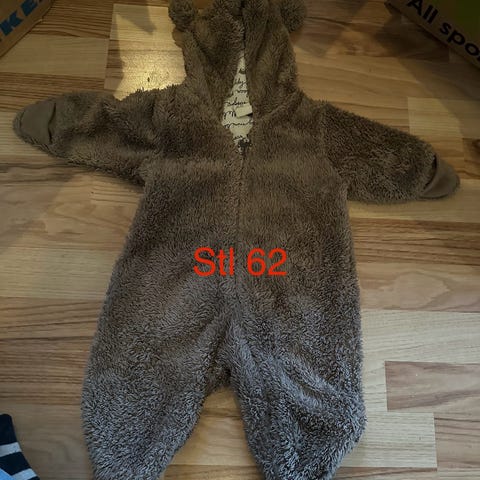 Brunfärgad overall med huva och dragkedja framtill. Overallen har små öron på huvan.