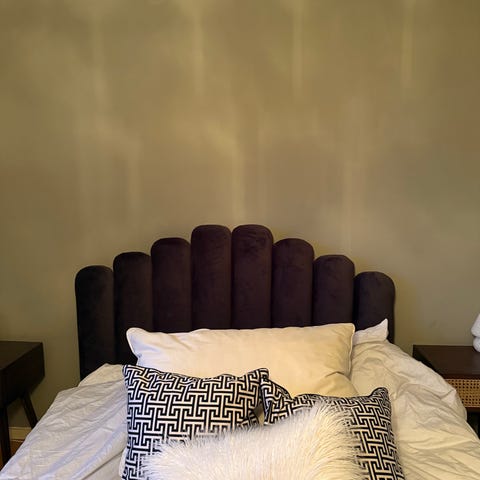 Snygg sänggavel 160cm el i beige plysch tyg