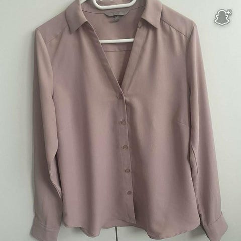 Beige skjorta med långa ärmar, krage och knappar framtill. En bröstficka.
