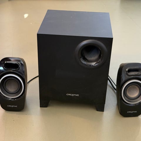 Högtalare, bra ljud. Säljer för att jag behöver inte dem. Se bild för liten defekt men funkar ändå samt hur man kopplar, sedan är det vanlig sladd för väggkoppling. Köpta för 2000kr men är gamla därav priset