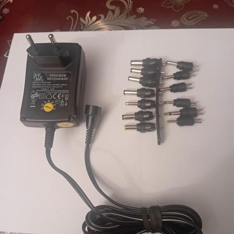 Adaptern har justerbar utspänning och sju olika utgångsval mellan 1.5 och 12 V.