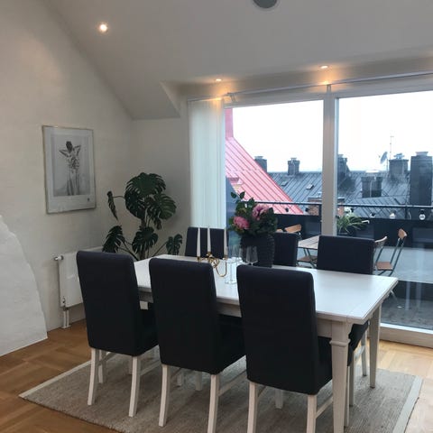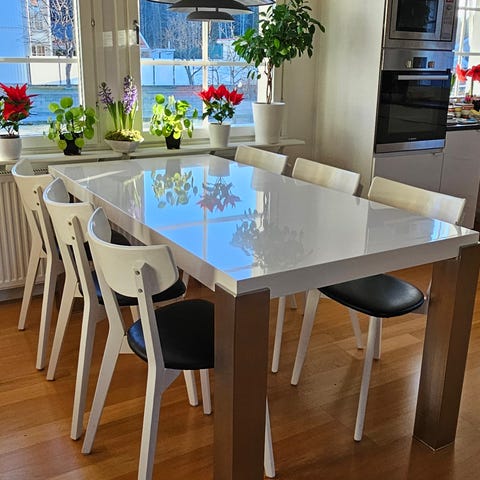 Ett fint matbord i glas från ILVA. Kan göras större med inbyggd inläggsskiva. Medföljer 6 stolar i skinn. Använt men i bra skick. Ord pris: 25000kr säljes för 7000kr