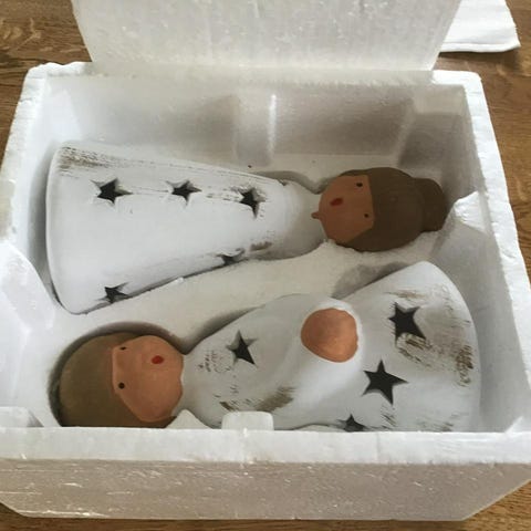 Fynda .. kartong med keramik juĺtomtar mm i fint begagnat skick.