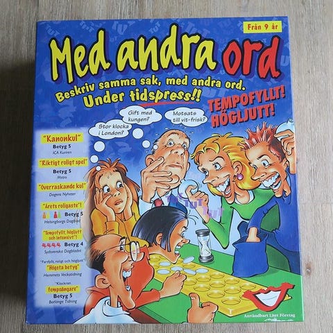 På minuten - ett sällskapsspel där man ska lista ut det rätta svaret med hjälp av ledtrådar som ges i fallande svårighetsgrad. Man spelar i lag och man har som sig bör en minut på sig. Ett svar per ledtråd får man avge om inte rutorna på spelplanen säger något annat. En liten twist i spelet är att det frågande motståndarlaget får kika på ledtrådarna innan de sätts i sin plasthållare och därmed försöka gissa på vilken nivå det svarande laget kommer att ta svaret. På så sätt kan båda lagen få poäng. Kategorierna är åtta till antalet och slumpas fram på korten. I gott skick. 150:-. Skickas ej, kan hämtas i Helsingborg.