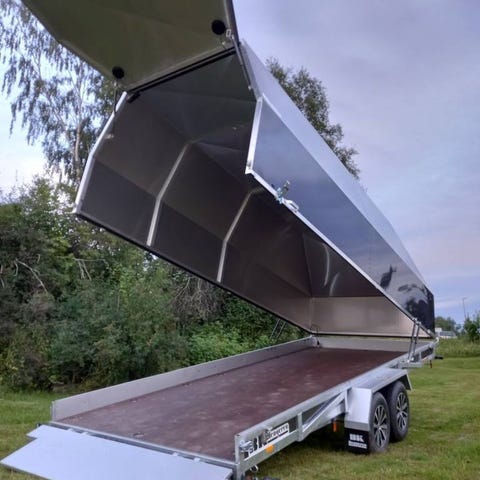 Alu-kåpa med hydraulisk tipp och rampöppning för bil, stenskottsskydd, LED också invändigt i kåpan, backljus