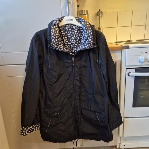 Rejäla dragkedjor, reglerbar i midjan och vid huva. Huvan är pälsklädd på insidan. Maskintvätt 30 grader. Stl 40/42. Nypris 899:-