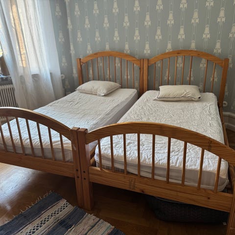 Nypris för säng och madrasser är 15 000 kr. Mitt pris för sängen (utan madrasser) är 5000 kr