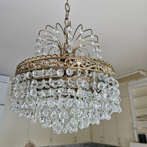 Kristall girlanger , droppar och stora infattade prismor. Mycket vacker och ger vackra ljus effekter.