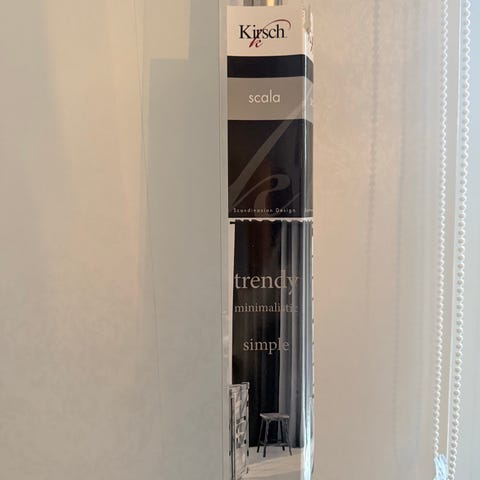 Komplett gardinstång kirsch cloud med fästen. Kängs 160 - 300 cm. 3 väggfästen. Två oöppnade paket med ringar. Totalt 20 st plus en lös ring.