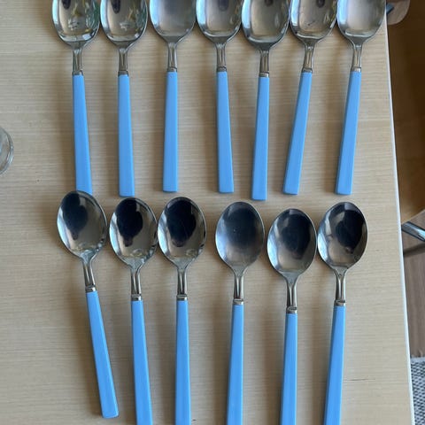 Bestickset med 12 skedar, varav 6 med gula plasthandtag och 6 med blå plasthandtag. Skedarna är tillverkade i metall med plastdetaljer och är avsedda för allmänt bruk.