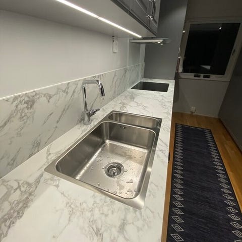 En jättefin marmorerad bänkskiva i black core från KVIK säljes pga av felköp. Den har en underlimmad ho i ena änden och i övrigt helt orörd. Bänkskivan är 3,13m lång och tillräckligt djup (72cm) för att täcka även XXL -skåp. Anpassad så att vasken passar i ett 60-skåp med ett 30-skåp till höger om vasken. Skivan är lite fasad i framkant längst till vänster för att kunna ansluta till en annan skiva i ett hörn. Lätt att kapa på både längd å bredd då den är genomfärgad svart och kompakt. Ordinarie pris med 25% rabatt är ca 20800.-