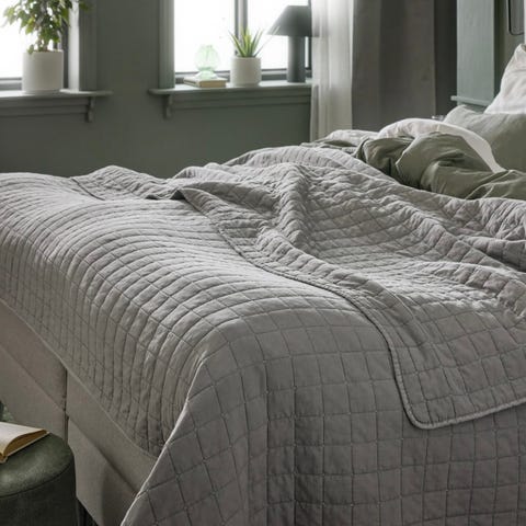 Säljer ett överkast i marinblå färg, till en 180 bred säng med 2 kuddar i måtten 35x35