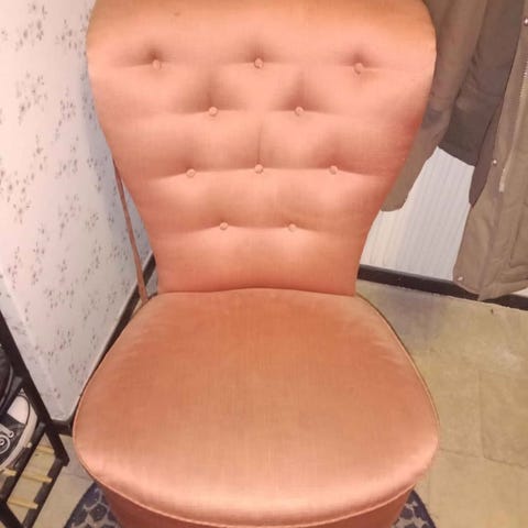 Klädseln är i originalskick med visst bruksslitage, men ger en härlig patina för den som gillar äkta retro. Passar både som sy-/hobbyfåtölj eller som unik inredningsdetalj i vardagsrum, sovrum eller ateljé.