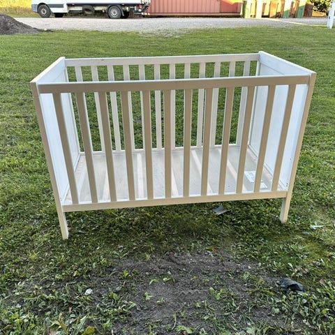 Vit barnsäng i trä med dekorativt mönster
