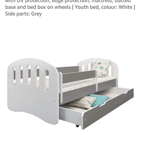 Vit barnsäng tillverkad i trä med dekorativt mönster på huvud- och fotgavel. Sängen har ribbotten och är avsedd för barn.