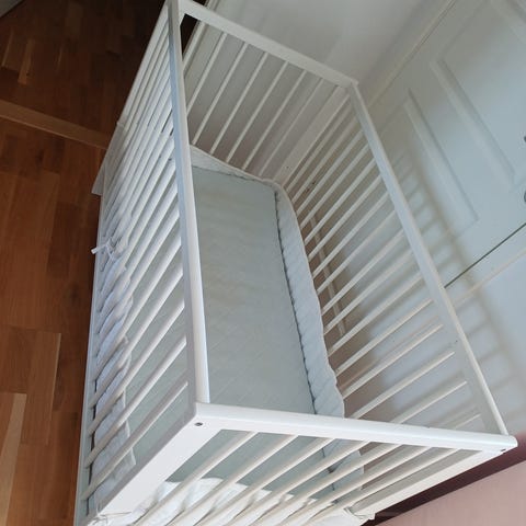 I generellt bra skick förutom lite skav (se bilderna) skickar med både madrass och 2st lakan samt även ett påslakan sätt som vi aldrig använt, endast upptvättad.
