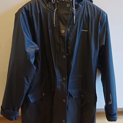 Regnkappan är lite längre och försluts med knappar.