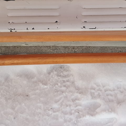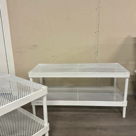 Hatthylla, skoställ och kroklist i grått trä/stål.