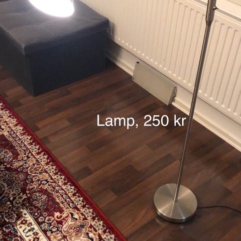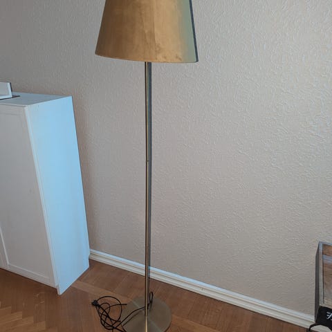 Snygg golvlampa, som passar till exempel ett ljust tonårsrum. Höjd: 150 cm. Skärmens höjd är 30,5 cm. Diameter top: 35 cm. Diameter botten 45 cm.