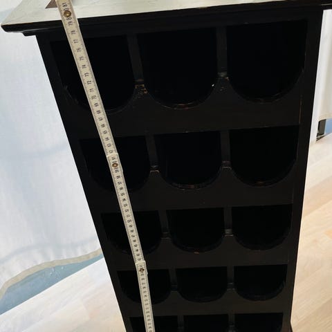 Vinställ/hylla i metall säljes. Unik. Får plats 20 flaskor. 126 cm lång, 32 cm hög och 24 cm djup. Se bilder för håll på baksidan för att sätta upp den på väggen.