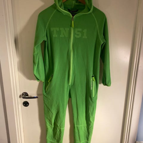 Jumpsuit One Piece grå/lila med luva stl.160 med tvåvägs blixtlås fram och sidfickor + frontfickor.