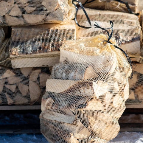 10st helt nya vedsäckar rymmer 1,5m3 ved. Pris 1200 kr för alla 10. Ny pris 2500kr. Kan skickas !
