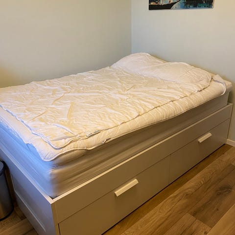 Säljer en IKEA BRIMNES sängstomme med förvaring i vitt, storlek 140x200 cm, tillsammans med madrass. Allt säljs som ett paket.