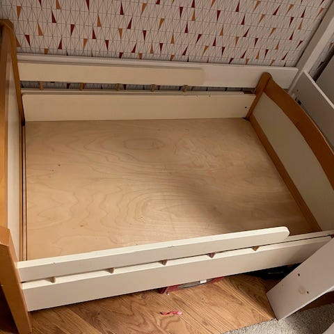 Utdragbar barnsäng i trä.