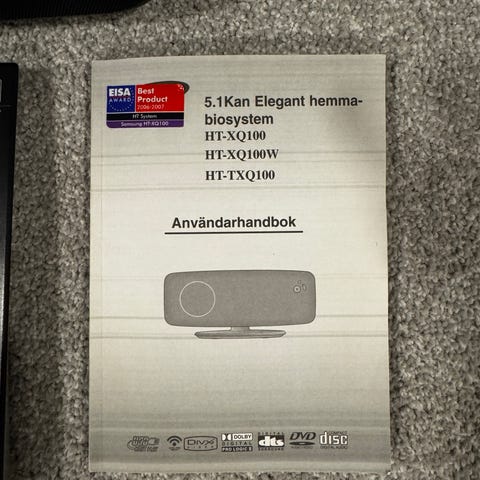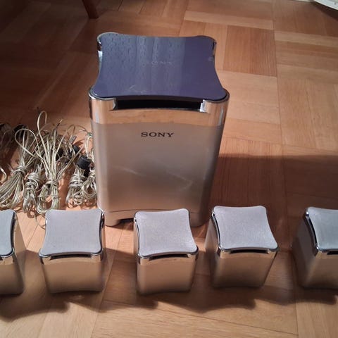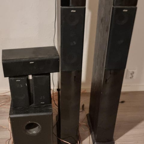 Bilden med det uppackat är hittad online, men jag kan fota systemet vid intresse eftersom det just nu ligger nedpackat. Det är ett rejält och diskret system med mycket bra ljud och i fint skick. Några små skavsår på högtalarna där det är hål i tyget, men inget som syns direkt från lite håll. Finns att hämta i Varberg eller Falkenberg, Halland.