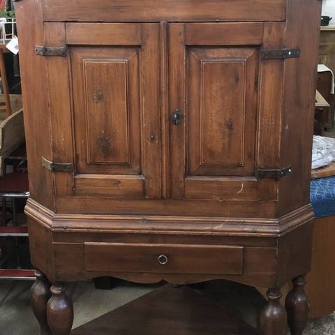 På det andra skåpet har en bit (ca 4 x 6 cm) faner fallit av. Lätt att laga för en kunnig. Dessutom finns en svartnad rot/kvist över lådan (se bilder).