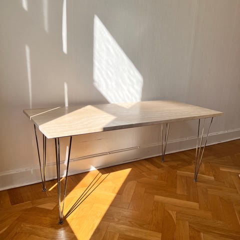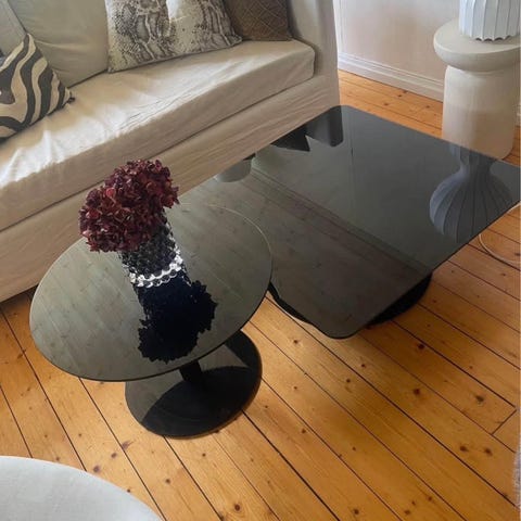 Säljer dessa fina bord från Ferm Living, modell Travertine Table large & medium. Borden är i fint skick förutom att på det mindre sidobordet så har stenskivan spruckit. Detta går att laga eller om man vill lägga i annan skiva.