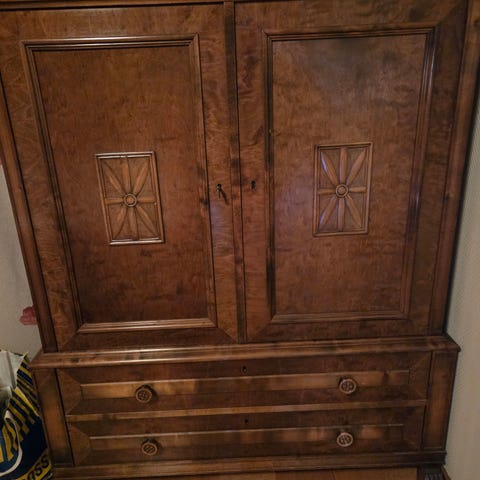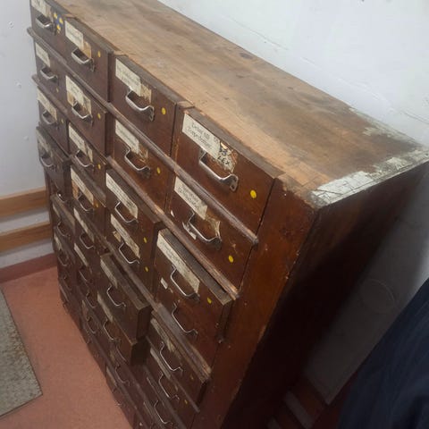 Antikt träskåp, sekelskifte, med lådor, lådfack, postfack, (15 st) i trä, och en utdragsskiva i trä. För den händige att fixa till ett bättre skick. Nyckel finns till låset. Handtag och fack för innehållsinformation i metall.
