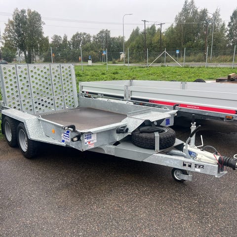 En robust uppkörningsramp med bra grepp förenklar lastningen och gör att även större maskiner tas ombord utan problem. Släpet står stabilt tack vare justerbara stödben, och du kan enkelt komplettera med tillbehör som vinterdäck, lås eller reservhjul beroende på dina behov.