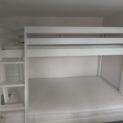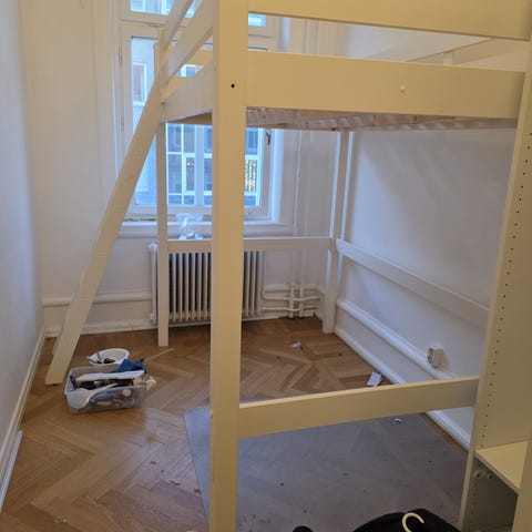 Loftsängsstomme m. arbetsskiva o nästan ny madrass + bädd