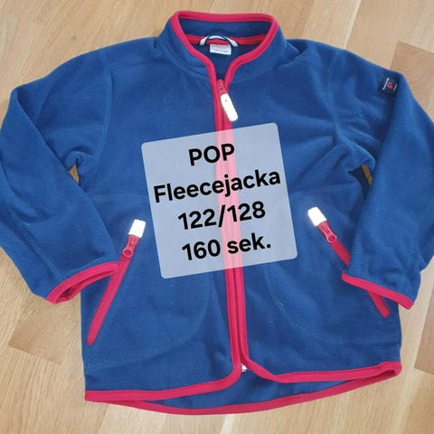 Två svarta skalbyxor och en svart fleecejacka i från POP. Byxorna som är i stl 128 har lite slitage på knäna och rumpa och på ena byxan ett litet hål, se bild 2. Byxorna saknar hällor. Jackan är i stl 122/128.