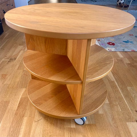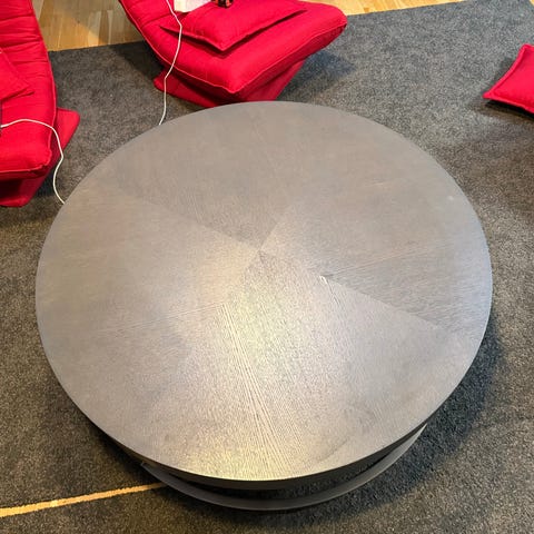 Vackert runt soffbord i massiv ask med handflätad rottingskiva.