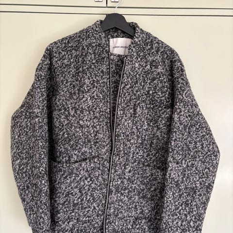 Säljer en grå, fluffig ulljacka från Levete inköpt i höstas. Jackan har en rak passform, stora fickor framtill och stängs med dolda knappar. Perfekt för kyliga dagar och ger en clean, stilren look. 60% Polyester och 40% Wool
