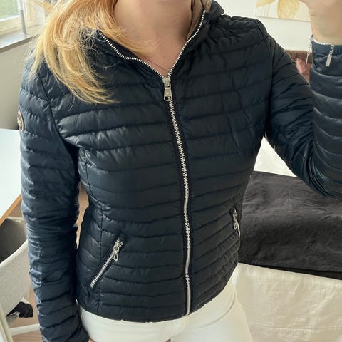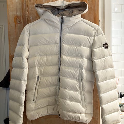Säljer en snygg vit pufferjacka från Colmar med ljusrosa foder och stor huva med pälskrage. Jackan har dragkedja framtill, två fickor med dragkedja och quiltad design. Perfekt för kalla dagar och riktigt mysig att bära. Jackan har tyvärr fått en reva i tyget på ena armen, se bild. Detta går att lämna in och fixa snyggare. Storlek på jackan passar S/ liten M.