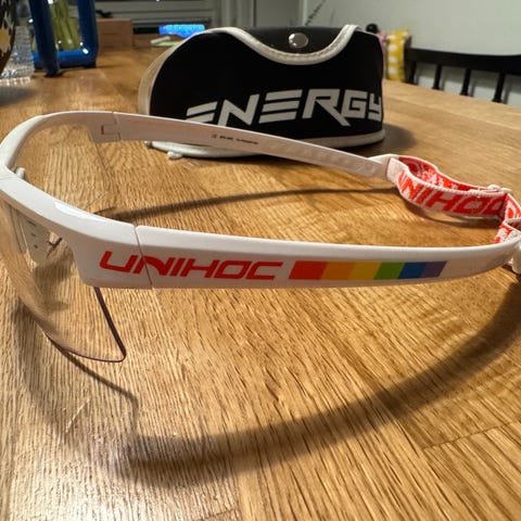 Innebandyglasögon i väldigt fint skick. Storlek JR. Svarta och vita med med fodral och en rengöringsduk.