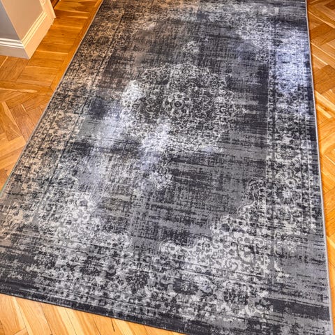 2 läckra mattor i gråtoner och svart. ytterkant i konstskinn och mönster i velour/plysch. 230x160 cm. 300kr styck