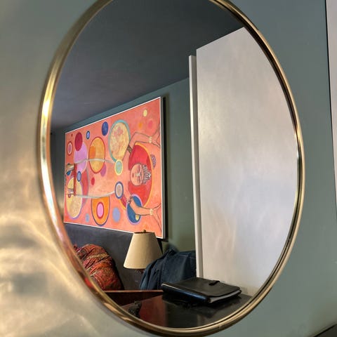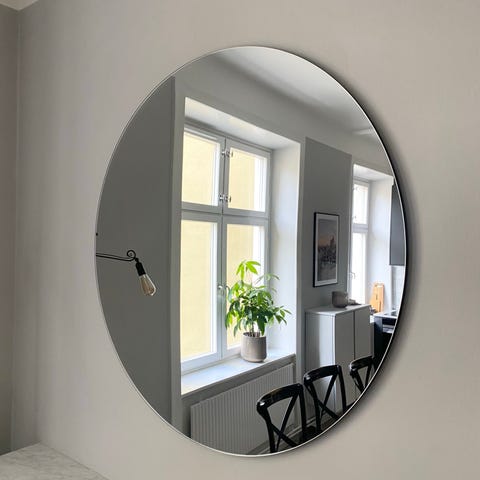 Superfin spegel. Ritad och producerad för arkitekt. Helt unik. Rund med en kant av mässing. Diameter 60cm. Hål för upphängning diameter 5cm. Se bild. Hängs lätt upp med krok som finns beslagsbutiker.