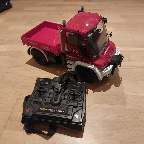 Radiostyrd dumper och hjullastare. Båda har belysning som lyser under färd samt att skopa/flak går att lyfta/tippa. Hjullastaren är utrustad med en förare. Sparsamt använda och väl omhändertagna men finns tecken på användning då dom är begagnade och inte längre nya.
