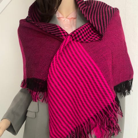 Färg: röd/cerise med blommönster och dekorativa tofsar.