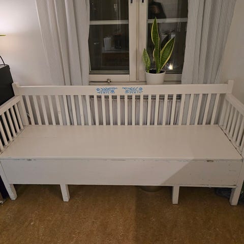 Fin gamma soffa med förvaring under lock - förmodligen från tidigt 1900-tal. Inköpt på Överjärva Antik 2010. Målad i ljusgrå linoljefärg. Bra kvalitet på det klädda locket. Längd ca 113 cm, djup ca 47 cm