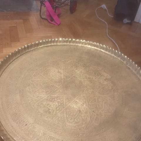 Jättefint orientaliskt fat (till rökbord) i mässing, koppar och nysilver. Köpt i Marocko på 1960-talet. Diameter ca 70 cm. Finns att hämta i centrala Kalmar.