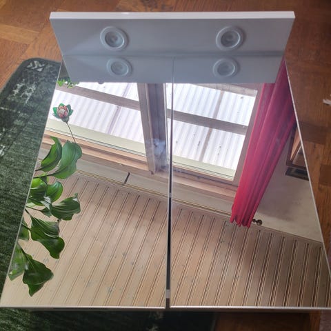 Snygg svart spegel 42 x 78 cm, oanvänd med belysning till badrummet. Märke Hafa. Har ej varit uppsatt, så skick som ny.