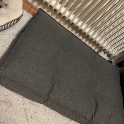 Hunddyna/kudde, gråmelerat tyg på ena sidan, grå fleece på andra sidan, 70×55 cm, ca 10-15 cm tjock/hög. Dragkedja, tvättbart överdrag. Aldrig använd.